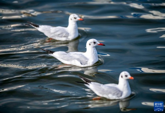 11月21日,幾隻紅嘴鷗在水面游弋。