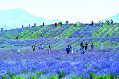 游客在位於新疆霍城縣蘆草溝鎮四宮村的薰衣草農場游玩。新華社發