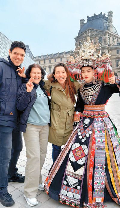 在巴黎街頭,一位中國女孩頭戴綴滿銀飾的瑤族頭冠,身著刺繡精美的民族服飾,從盧浮宮門前緩緩走過,清脆的飾響伴隨裙擺搖曳,引來路人頻頻駐足圍觀、拍照驚嘆。“這是電影造型嗎?”“是哪個國家的服飾?”面對好奇的追問,女孩微笑著一一作答。