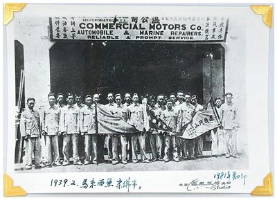 回國前,溫祺芳與其他有志南洋華裔青年在汽車修理鋪牌匾下合影。中國華僑歷史博物館供圖