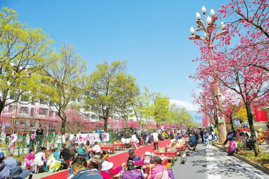 雪山路櫻花大道上的納西特色“千人長街宴”。 本報記者 李鐵成 攝