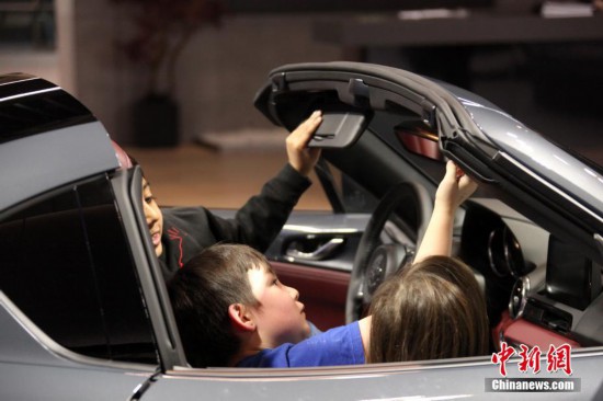 当地时间2月14日,2020年加拿大国际车展在多伦多开幕。各大国际汽车厂商的上千款车型参加此次为期10天的展会,其中有近40款车型在此次车展上进行加拿大或全球首秀。图为参观车展的小车迷被一款敞篷跑车所吸引。中新社记者 余瑞冬 摄