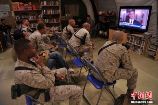 资料图:当地时间2011年5月1日,美国总统奥巴马宣布“基地”组织领导人本 拉登已被打死。图为驻阿美军某团士兵关注奥巴马演讲的电视新闻。