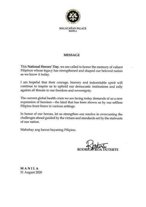 在“国家英雄日”声明中,杜特尔特强调,正是历史上和现代的英雄主义精神,将菲律宾塑造成“备受爱戴的国家”。