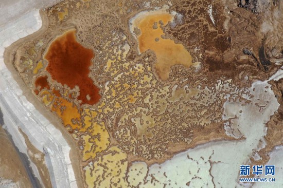 这是6月17日在死海南部内韦佐哈尔度假村附近拍摄的盐结晶形成的景观(航拍照片)。