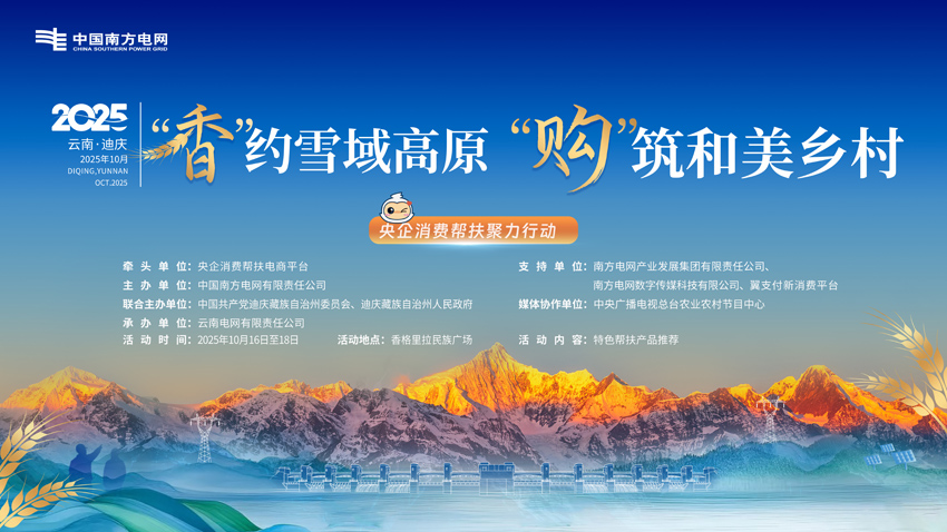 10月16日至18日,中国南方电网有限责任公司将联合云南省迪庆藏族自治州委、州人民政府,在香格里拉市开启“央企消费帮扶聚力行动(云南迪庆场)”。活动通过搭建“暖心直连桥”,让源自和美乡村原产地的绿色、健康、特色农产品,跨越地域阻隔,直达全国消费者身边。