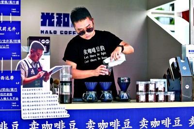 在辽宁沈阳举行的咖啡市集上,咖啡加工工在售卖咖啡豆。新华社发