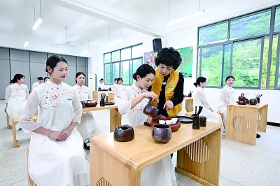 在福建,武夷山旅游职业中专学校的茶艺老师在课堂教授茶艺。新华社发