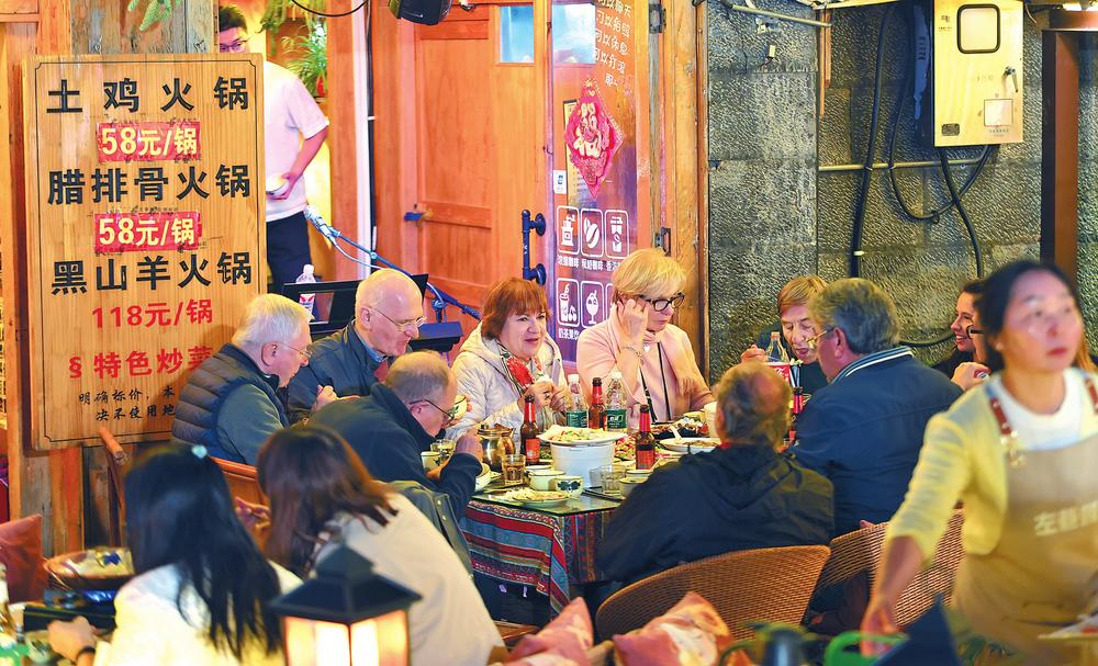 凭借优美风光、浓郁风情、独特文化体验和日趋完善的服务,丽江吸引众多外国游客前来体验“有一种叫云南的生活”。据丽江市公安局出入境管理支队统计数据,今年以来,全市临时入境人员达78.97万人次,同比增长47%。图为外国游客在丽江古城品尝美食。(记者 陈飞 摄)
