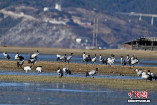 云南香格里拉纳帕海越冬黑颈鹤达573只创新高
