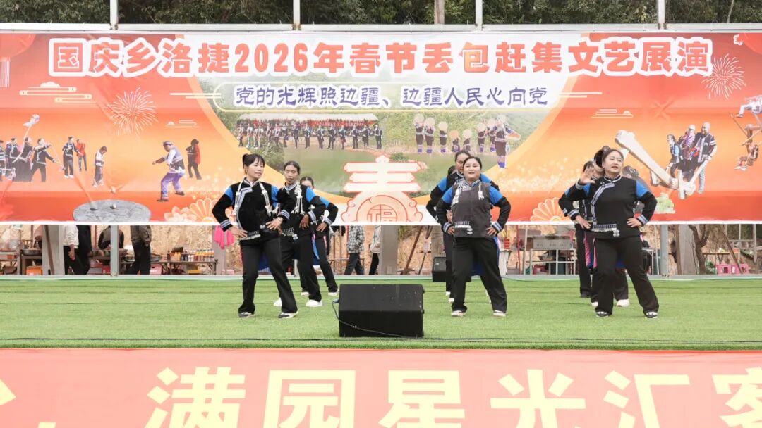 2月18日,普洱市江城县国庆乡洛捷村云南洜岊(luò jié)盛茗休闲农业园区内锣鼓喧天、年味浓郁,2026年国庆乡春节丢包赶集活动正式拉开帷幕。活动以“农文旅融合、民族味十足”为特色,打造集赛事、民俗、美食、文艺、休闲于一体的新春盛宴,让各族群众与游客在山水田园间乐享佳节。